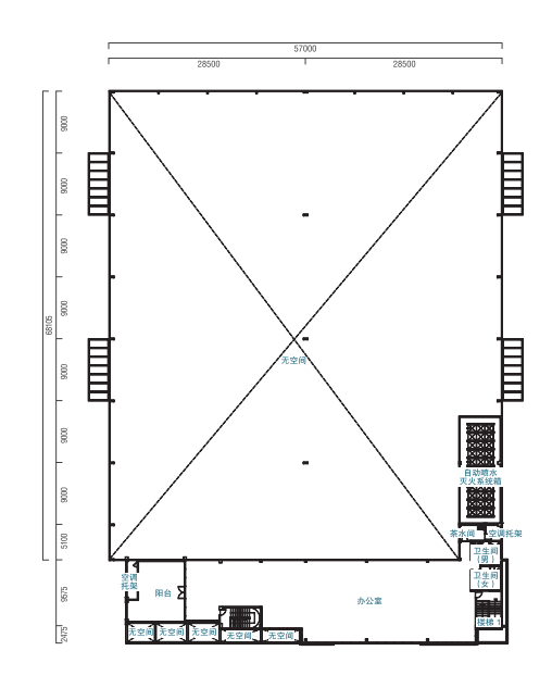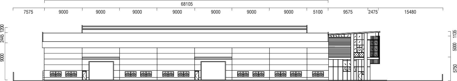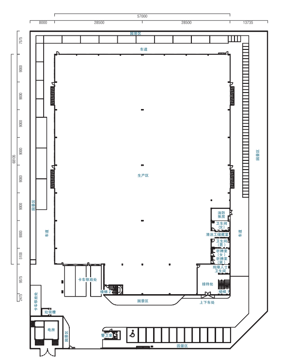 电动卷帘门和低碳钢门(生产区域), 钢化玻璃门(入口区域)